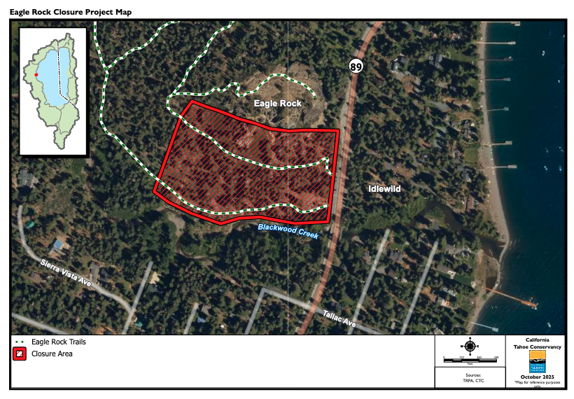 SOUTH LAKE TAHOE, Calif. — The California Tahoe Conservancy will temporarily close the Eagle Rock Trail to protect public safety on November 10, 2025. The Conservancy expects the trail closure to last two to three weeks, weather depending, to facilitate work to address hazard trees adjacent to the trail.