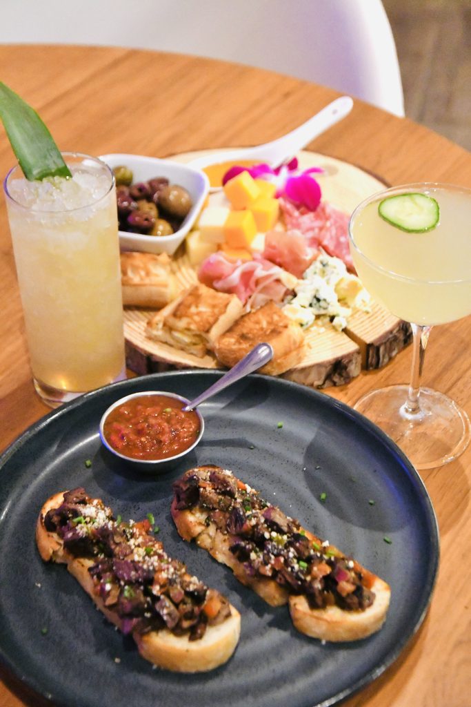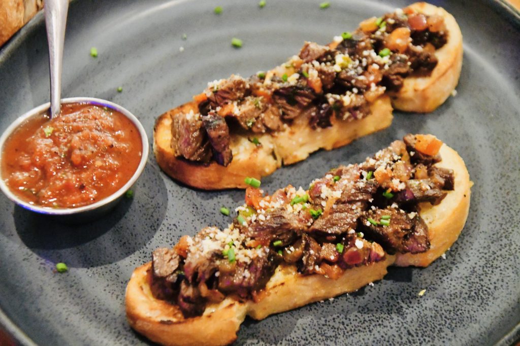 Carne Asada Toast: Think of this dish as a Mexican spin on a classic crostini. The base of grilled bread remains intact, but after that the dish asks you to buckle up for the ride. Supremely seasoned and grilled carne asada (beef) is piled high along with caramelized onions, tomato relish, cotija cheese, fresh cilantro and served with a side of salsa.