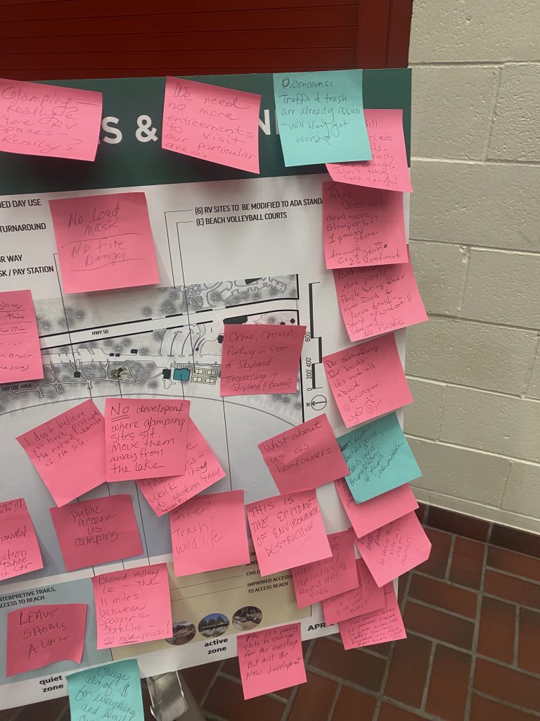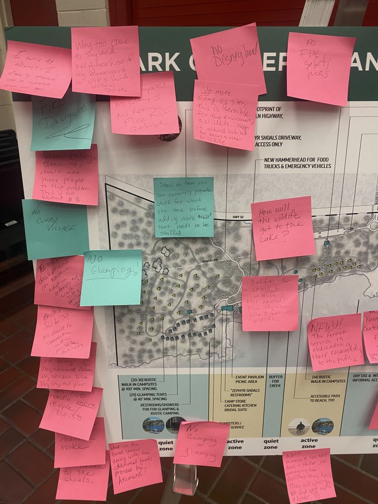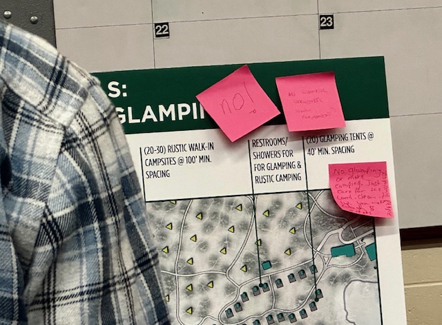 Other concerns questioned how the concepts align with U.S. Forest Service requirements. The only service requirement listed on one of their posters for Zephyr Shoals is public restrooms, yet the concept provides upwards of 20 campsites and 20 glamping sites. Certain sticky notes accused plans being all about money.