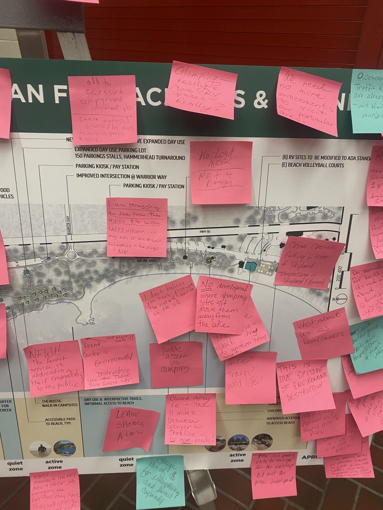 “Why don’t you put in Disneyland?” one gentleman shouted. A women raised her voice, pointing at U.S. Forest Service’s Erik Walker, “You sold us out!” She went on to express distress over alcohol use, drugs and other concerns at Zephyr Cove and Zephyr Shoals.