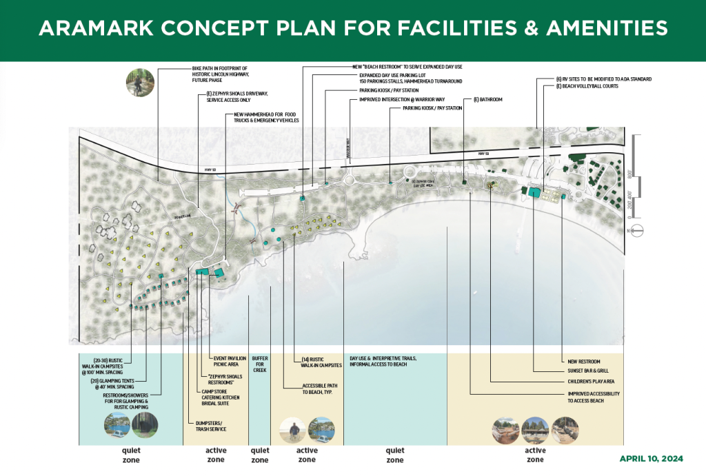 Lisa Cesaro, Senior Director of Marketing at Aramark said Zephyr Cove’s current campsites across Highway 50 are popular with families and providing “family oriented” recreation activities is a part of USFS’s objectives.