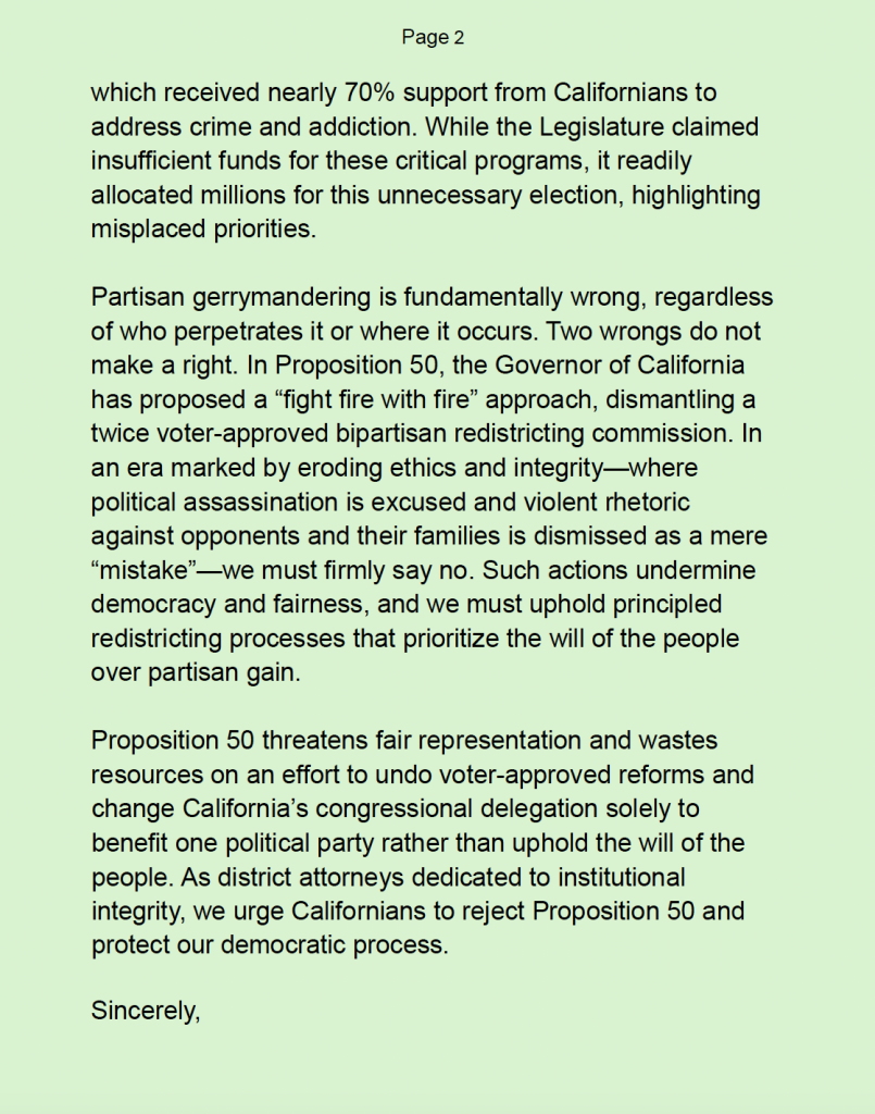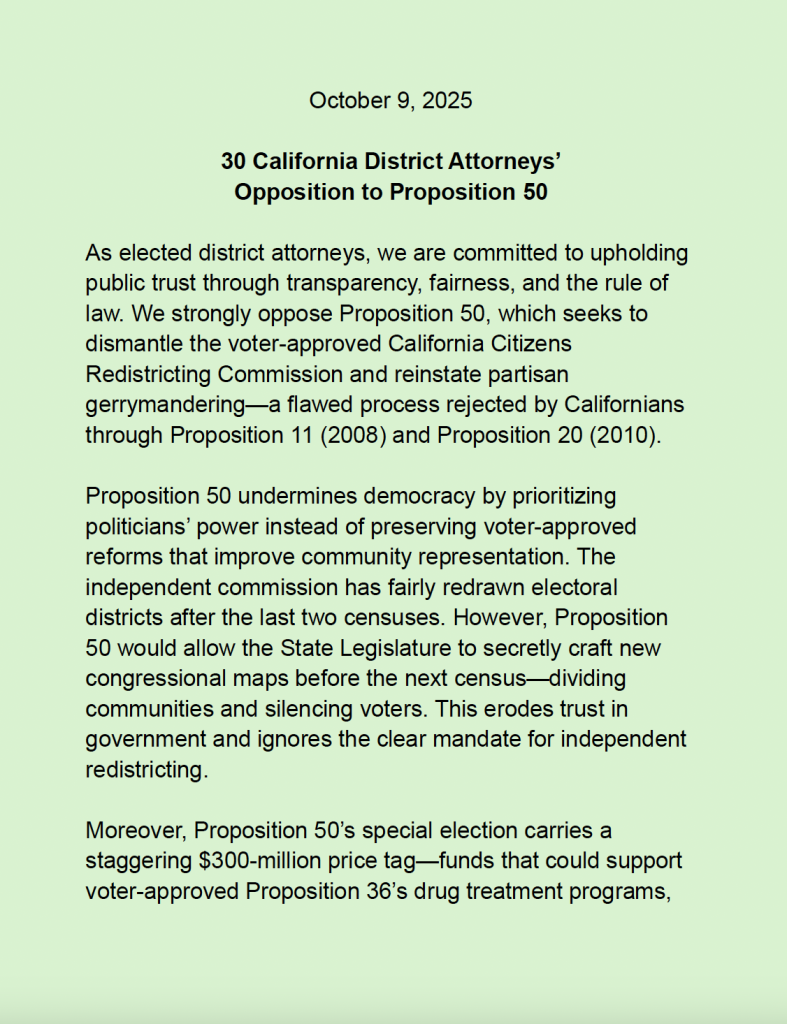 “Proposition 50 undermines democracy by prioritizing politicians’ power,” the letter reads, “instead of preserving voter-approved reforms that improve community representation.”