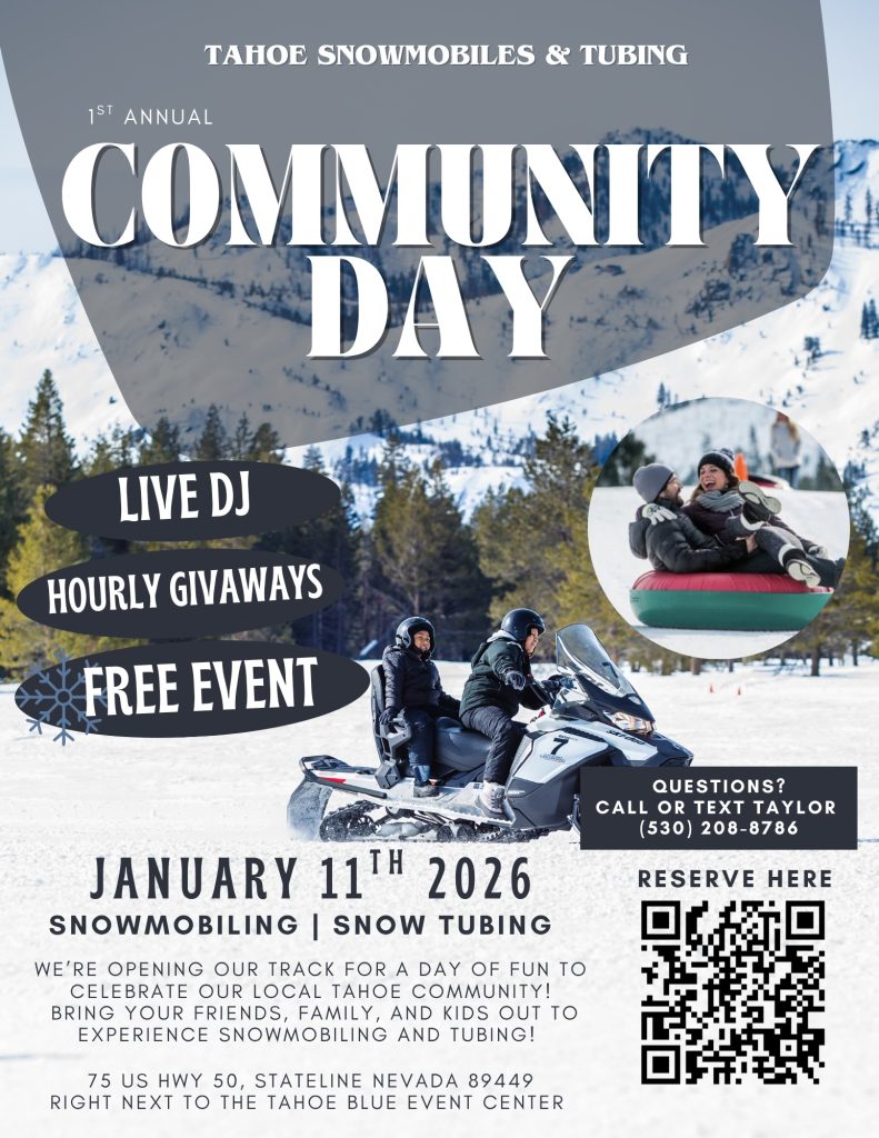 STATELINE, Nev. – Tahoe Snowmobiles is calling all Tahoe locals to their first-ever snow-clad Local Community Day event on Sunday, January 11 from 10 a.m., to 4 p.m., offering free tubing, and snowmobiling along with chances to win giveaway prizes.