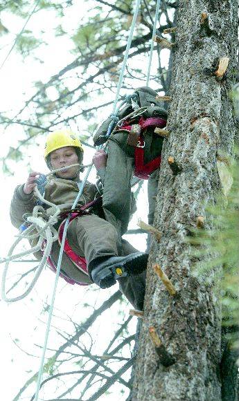 Aerial rescues are rare compared to tree climbs. Climbing a tree allows a forester to top a tree with a chain saw or anchor a rope to it so it can be pulled to fall in a certain direction. For the climbing exercise, the CCC group strapped spikes to their boots and stabbed their way 55 feet up a narrow tree.