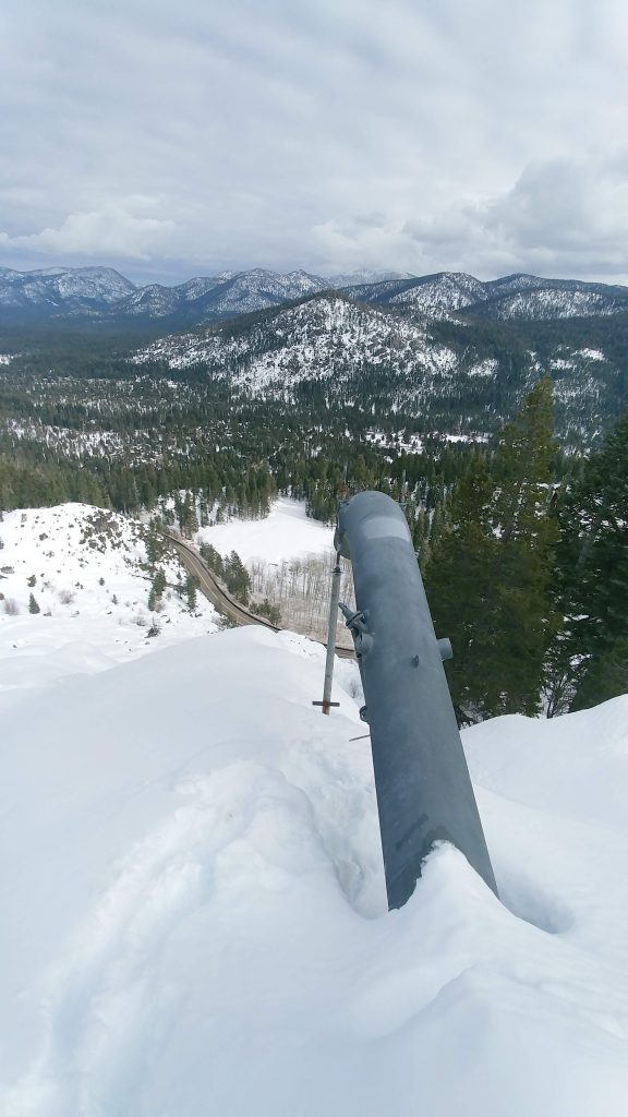 Explosives have been in use in the Sierra Nevada for a long time—the National Guard used to help until Caltrans procured their own artillery in the early 1960s. By the nineties, Caltrans had switched to the Gazex system, pneumatic cannons stationed along Highway 50.