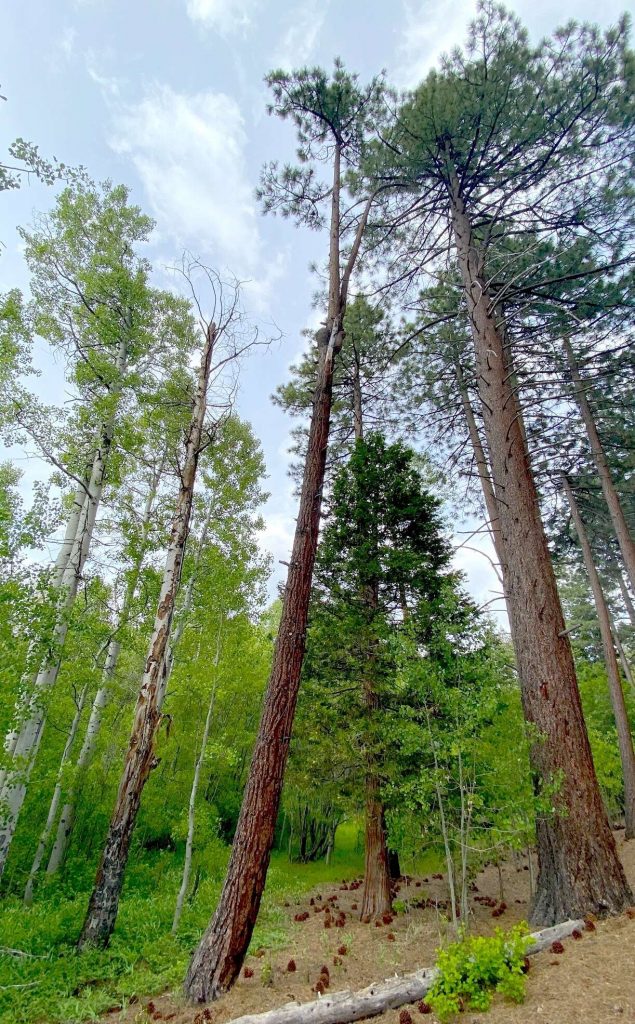 A pine tree stands tall next to a grove of aspen. It’s a few feet outside a popular Tahoe campground and steps away from the lake.